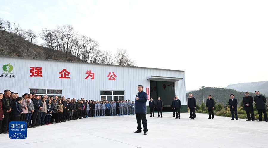 車間外,老鄉(xiāng)們聚集在一起,高聲向總書記問好。習(xí)近平同老鄉(xiāng)們拉起家常,回憶當(dāng)年他在陜北的知青歲月。習(xí)近平對老鄉(xiāng)們說,我在陜北生活了7年,當(dāng)年看到老鄉(xiāng)們生活很艱苦,心里就想著怎么樣讓大家生活好起來。這次來延安,看到一派碩果累累的豐收景象,交通條件大為改善,發(fā)生了翻天覆地的變化。過去陜北老鄉(xiāng)們修梯田、種莊稼,面朝黃土背朝天,掄起老鋤頭干活,廣種薄收,十分辛苦,如今山坡上退耕還林種上了蘋果,老鄉(xiāng)們有工作、有穩(wěn)定收入,孩子有好的教育,老人都有醫(yī)保,生活越來越好。從陜北的變化就可以看到中國的變化。習(xí)近平指出,現(xiàn)在,“兩個一百年”奮斗目標(biāo)的第一個百年目標(biāo)已經(jīng)實(shí)現(xiàn),絕對貧困問題解決了,老鄉(xiāng)們過上了好日子,但還要繼續(xù)努力往前走,讓生活越來越美好。陜北的氣候、光照、緯度、海拔等非常適宜發(fā)展蘋果種植,加上滴灌技術(shù)、矮化種植技術(shù)、選果生產(chǎn)線等不斷發(fā)展,就地賣出,銷路不愁,大力發(fā)展蘋果種植業(yè)可謂天時地利人和,這是最好的、最合適的產(chǎn)業(yè),大有前途。習(xí)近平強(qiáng)調(diào),中國共產(chǎn)黨是人民的黨,是為人民服務(wù)的黨,共產(chǎn)黨當(dāng)家就是要為老百姓辦事,把老百姓的事情辦好??照?wù)`國,實(shí)干興邦。要認(rèn)真學(xué)習(xí)貫徹黨的二十大精神,全面推進(jìn)鄉(xiāng)村振興,把富民政策一項(xiàng)一項(xiàng)落實(shí)好,加快推進(jìn)農(nóng)業(yè)農(nóng)村現(xiàn)代化,讓老鄉(xiāng)們生活越來越紅火。老鄉(xiāng)們爆發(fā)出雷鳴般的掌聲。