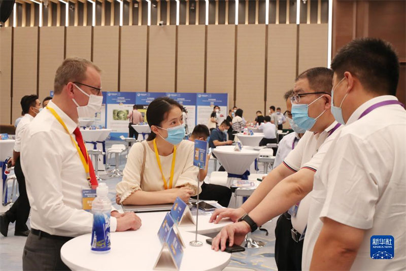 在第五屆中國國際進(jìn)口博覽會(huì)技術(shù)裝備展區(qū)展前供需對(duì)接會(huì)上,參展商代表(前左二)向采購商介紹企業(yè)產(chǎn)品情況(2022年8月8日攝)。新華社記者 方喆 攝