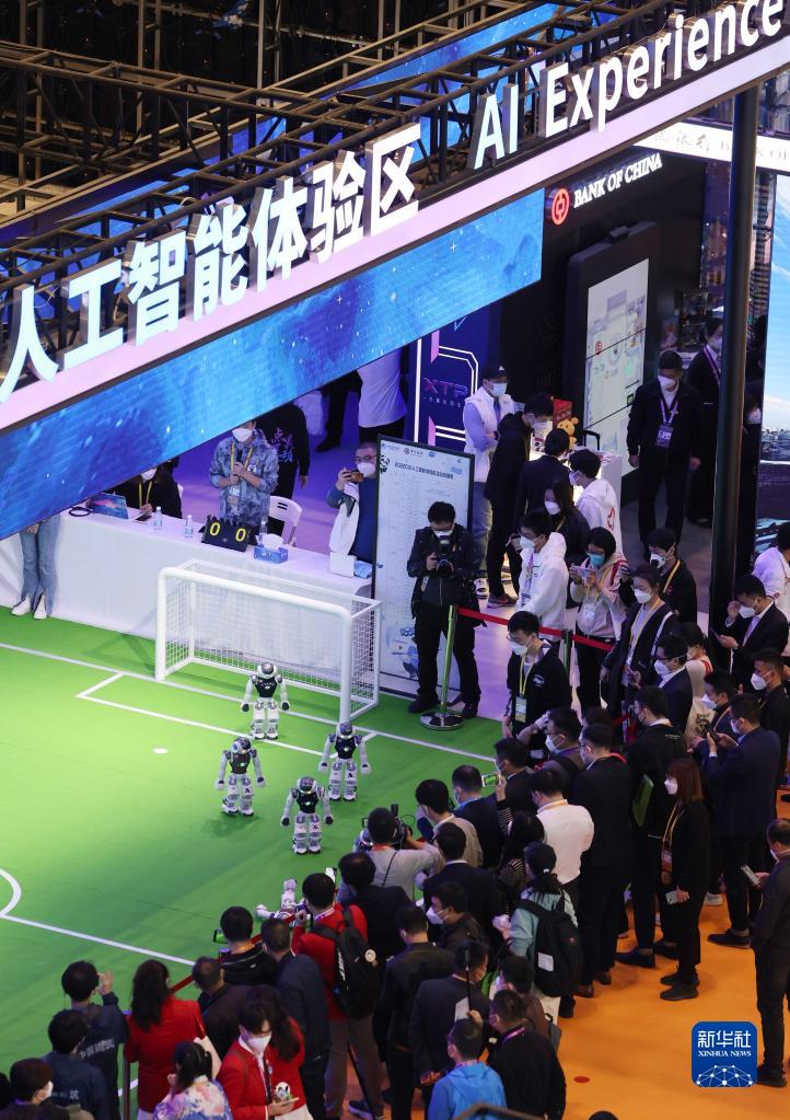 2022年11月5日,參觀者在第五屆中國國際進(jìn)口博覽會(huì)人工智能專區(qū)觀看機(jī)器人表演。新華社記者 金立旺 攝