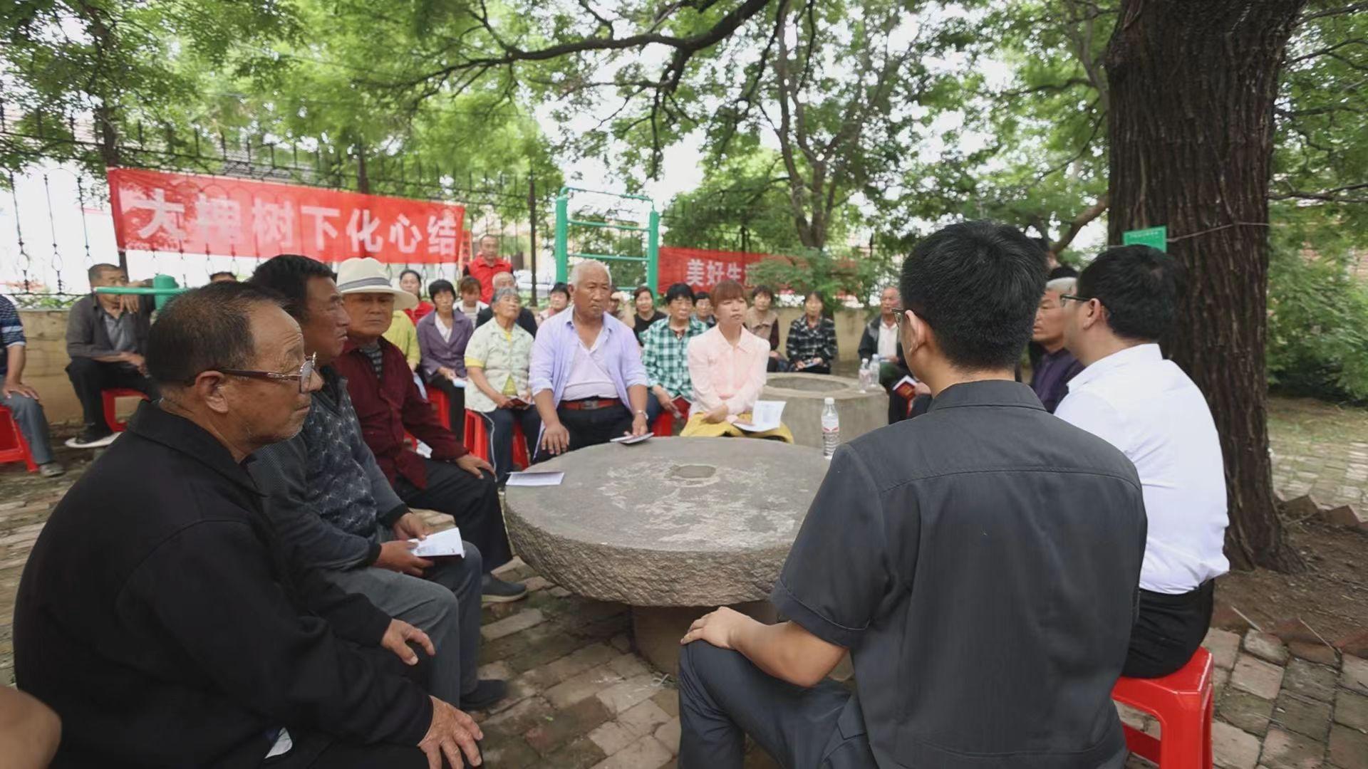 圖為平原縣張華鎮(zhèn)郝堂村口開展“大槐樹下講講理”活動。