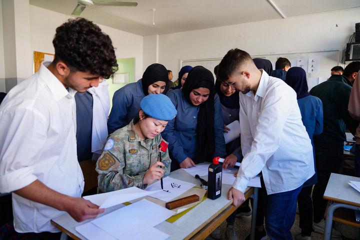2023年4月3日,中國赴黎巴嫩維和多功能工兵分隊(duì)維和女兵韋薇在貝魯特拉赫曼·尤努斯中學(xué)用中文書寫學(xué)生名字。新華社發(fā)(李竹林?jǐn)z)