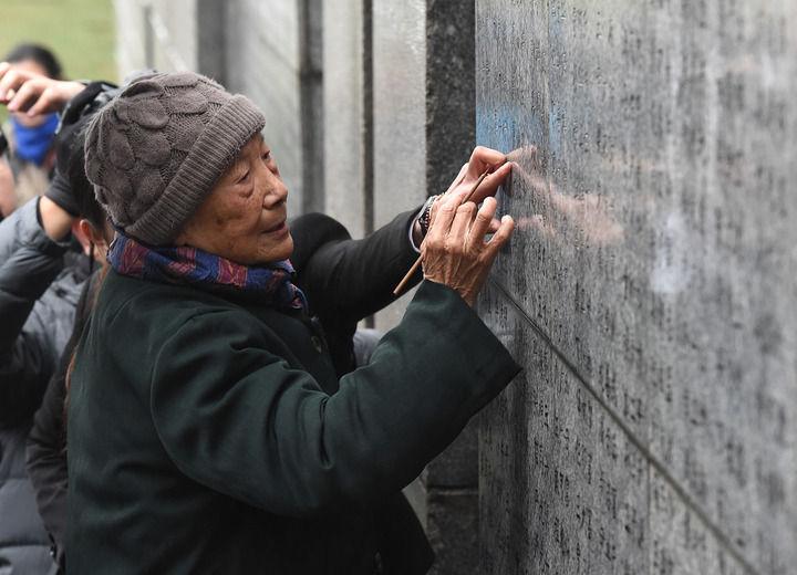 2018年12月10日,在侵華日軍南京大屠殺遇難同胞紀(jì)念館舉行的死難者遺屬家祭活動中,夏淑琴給遇難者名單墻上親人的名字添漆。新華社記者 孫參 攝