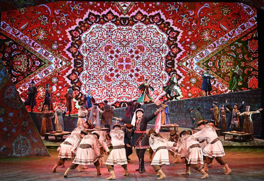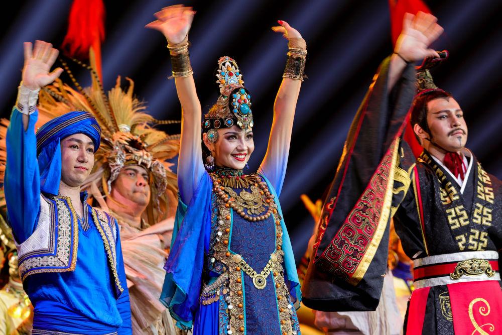 2022年4月22日,在新疆藝術劇院木卡姆藝術團劇場,舞蹈演員馬依熱·艾買提江(中)在舞劇《張騫》演出后向觀眾致謝。馬依熱來自烏魯木齊,11歲時前往北京跟隨專業(yè)舞蹈老師學習,學成后回到家鄉(xiāng),成為新疆藝術劇院歌舞團的一名舞蹈演員。“新疆的歌舞是中華傳統(tǒng)文化的一部分,是用來歌頌美好生活的。希望我的舞蹈,能增進各民族間的感情,促進文化交融?!瘪R依熱說。