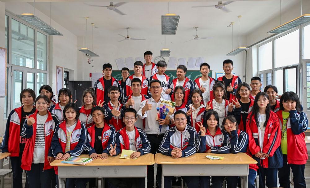 2024年9月10日,在新疆阿拉爾職業(yè)技術學校,援疆教師李斌傲(中)和23級電商班的學生合影?!?5后”年輕教師李斌傲是第十一批浙江臺州到新疆阿拉爾職業(yè)技術學校援疆教師中的一員,負責教授電子商務專業(yè)課程。他在學校主導籌建了電商實訓室,還帶了4個新入職的教師當徒弟?!芭嘤柡帽镜亟處?,就是打造一支帶不走的隊伍?!崩畋蟀琳f。