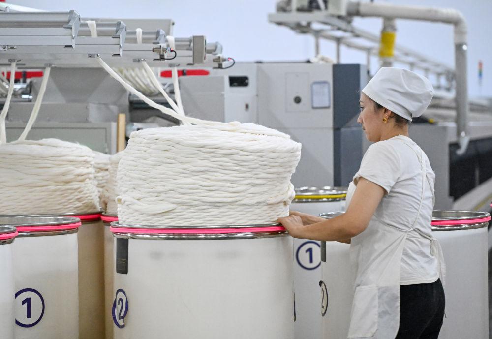2024年7月4日,新疆克孜勒蘇柯爾克孜自治州一家紡織企業(yè)的工人在紡紗車間工作。棉花和紡織服裝產業(yè)已成為新疆重要的民生產業(yè)和支柱產業(yè)。近年來,克孜勒蘇柯爾克孜自治州阿圖什市以棉紡織業(yè)為引領,積極招商引資,打造集紡紗、織布以及高端紡織品研發(fā)為一體的大型紡織產業(yè)園區(qū),為周邊鄉(xiāng)鎮(zhèn)群眾提供1500余個就業(yè)崗位。