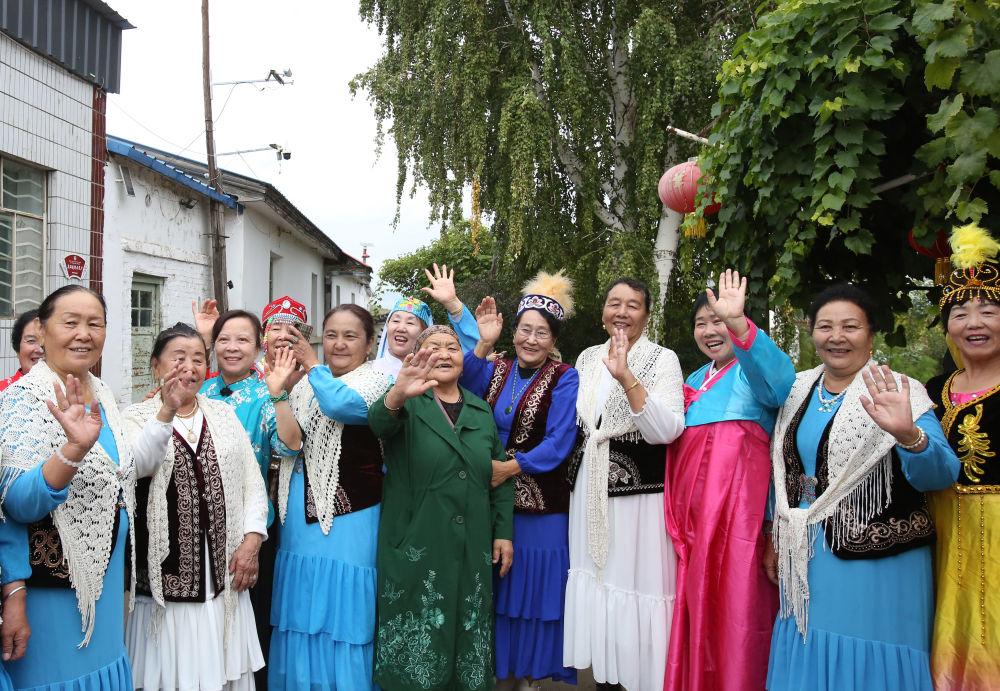 2025年9月9日,新疆阿勒泰地區(qū)阿勒泰市紅墩鎮(zhèn)的老人在“戶兒家”文化大院合影,該鎮(zhèn)居民由漢族、哈薩克族、維吾爾族、蒙古族等11個民族組成?!皯魞杭摇痹从谇迥枪_克族對甘肅、山西、陜西等省遷居紅墩鎮(zhèn)的40戶漢族居民的稱呼。100多年來,“戶兒家”幾代人與各族群眾相互融合、共同發(fā)展,成為各民族相互交融的典范。