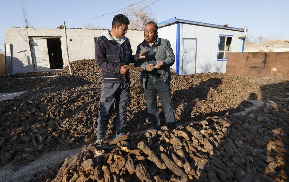 2024年12月4日,新疆民豐縣尼雅鎮(zhèn)甫甫克村村民麥麥提(右)同前來收購大蕓的商戶交流。自20世紀末新疆全面開展防風治沙工程并大力推進沙產業(yè)以來,麥麥提從在合作社挖大蕓賺工錢,到后來主動學習大蕓種植技術并創(chuàng)業(yè),一路走來小有收獲。2018年,他承包了10畝沙地種紅柳、大蕓。紅柳茁壯成長,大蕓產量頗豐,麥麥提年收入超過5萬元。