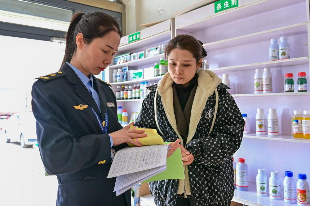 2024年3月21日,新疆阿克蘇市農業(yè)綜合行政執(zhí)法大隊的執(zhí)法人員在阿克蘇市農資市場查看農資經銷部的銷售臺賬。