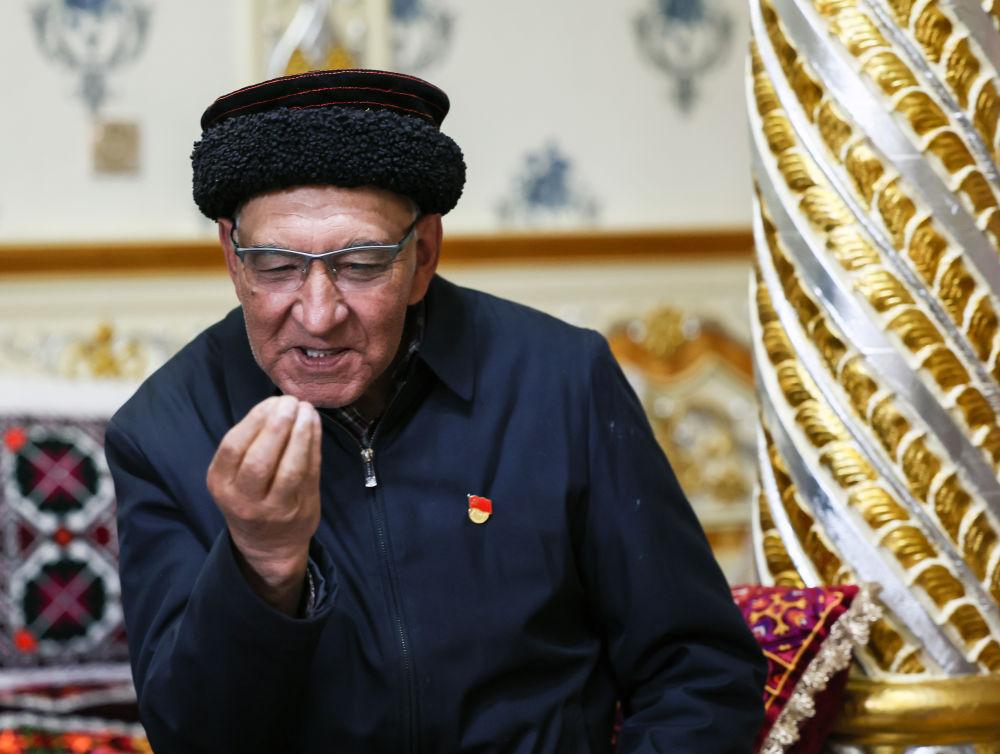 2023年9月4日,“時代楷?!崩R尼·巴依卡的父親巴依卡老人在新疆塔什庫爾干塔吉克自治縣的家中接受采訪。生活于帕米爾高原上的塔吉克族兒女,素來心中懷有“家是塔縣,國是中國,放牧守邊是職責”的愛國守邊精神。巴依卡老人一家三代70年接續(xù)守邊護邊,愛國奉獻的壯舉感動了無數(shù)國人。“邊境線是中國的邊境線,紅其拉甫是中國56個民族的紅其拉甫,我們的56個民族就要像石榴籽一樣緊緊抱在一起?!卑鸵揽ɡ先苏f。