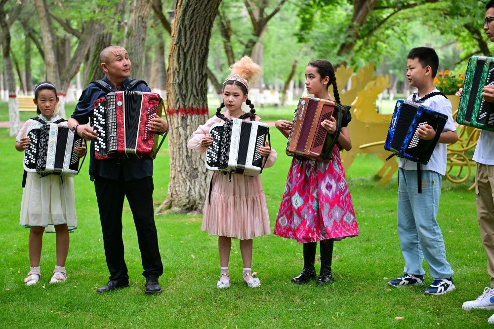 2024年7月24日,在新疆塔城市文化廣場,手風琴文化傳承中心老師道吾然·對山漢(左二)帶領學生練習手風琴。塔城市居住著漢族、哈薩克族、回族、維吾爾族、蒙古族、塔塔爾族、俄羅斯族等20多個民族,是一片多元文化沃土。手風琴是塔城市民間最廣為流傳的樂器,也是各族人民文化交流的重要媒介。近年來,塔城市深入挖掘手風琴文化,舉辦多場手風琴文化藝術節(jié)活動,為各民族文化交流提供平臺。