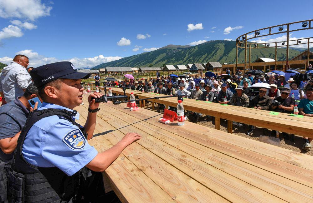 2024年7月22日,在新疆阿勒泰地區(qū)布爾津縣禾木哈納斯蒙古族鄉(xiāng)哈納斯村,喀納斯邊境派出所民警在村民大會上給村民宣講邊境法律法規(guī)。近年來,喀納斯邊境派出所通過“警村企黨支部聯(lián)合工作站”模式,聯(lián)合當?shù)厝罕?、景區(qū)一起解決游客難題,大大提升了警務效率,逐步形成了“景中警 貼心人”的旅游警務品牌。