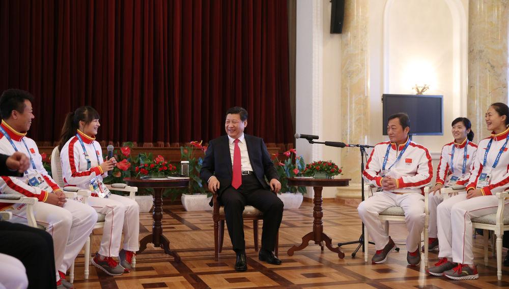 2014年2月7日,中共中央總書記、國家主席、中央軍委主席習(xí)近平在俄羅斯索契親切看望參加第二十二屆冬季奧林匹克運(yùn)動會的中國體育代表團(tuán)。這是習(xí)近平在座談會上與代表團(tuán)成員親切交流。新華社記者 蘭紅光 攝