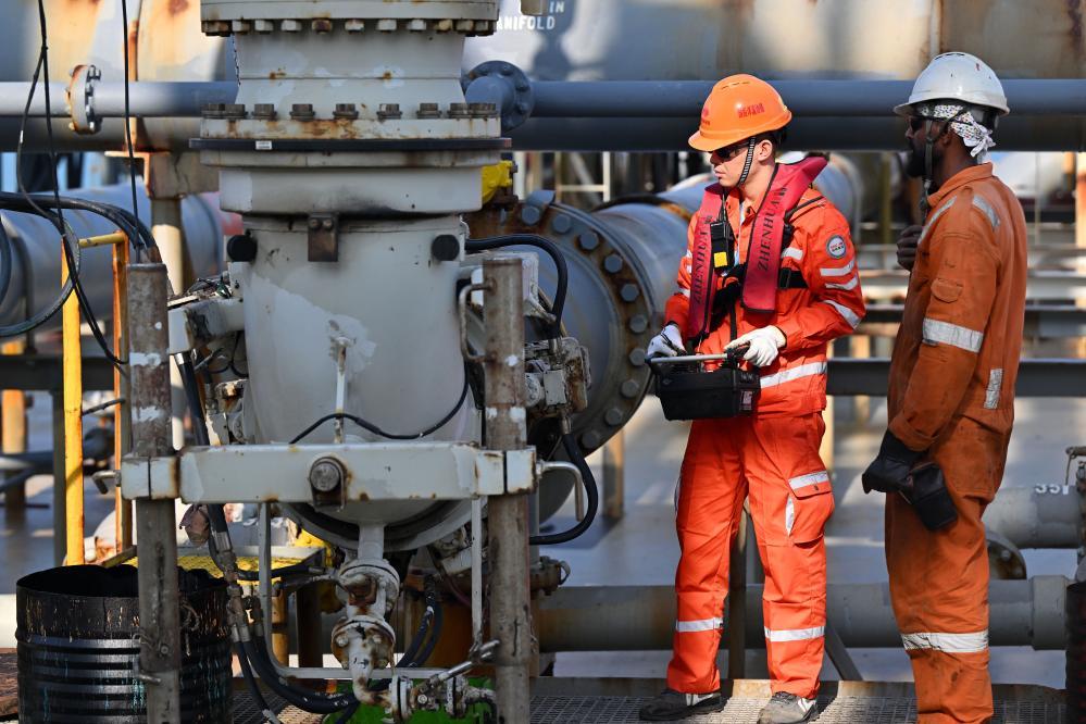 12月18日,裝載著石化原輔料的船舶抵達洋浦港后,國投洋浦油儲碼頭工作人員(左)和船舶外籍船員在進行卸油作業(yè)。新華社記者 郭程 攝