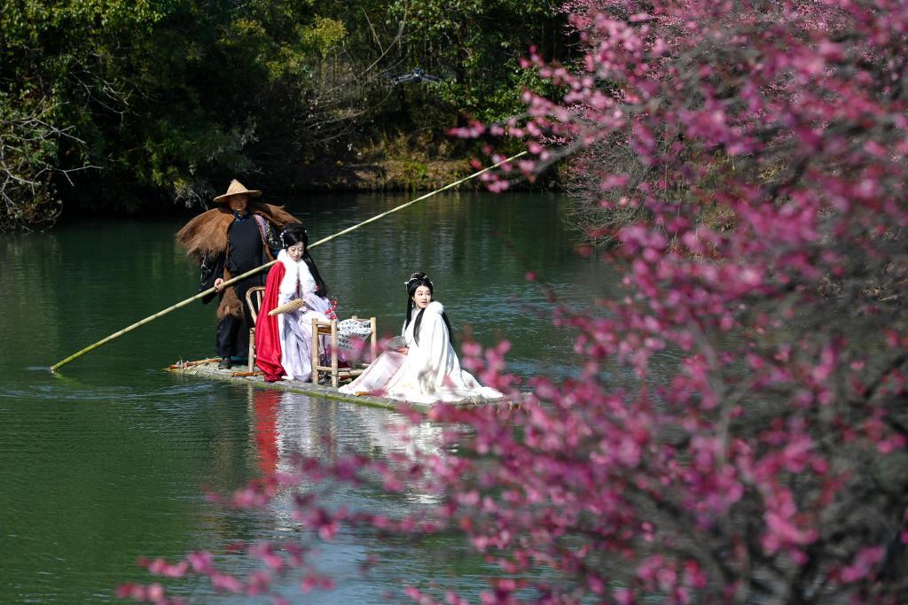 2025年2月18日,漢服愛好者在西溪濕地乘坐竹筏賞梅。新華社記者 黃宗治 攝