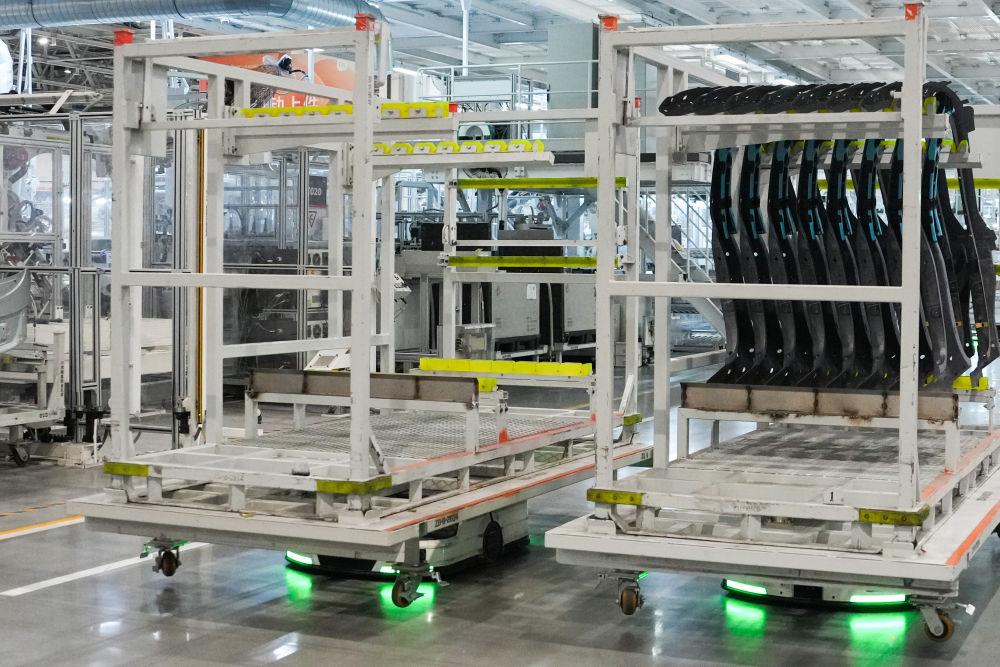 從研發(fā)制造到測試應用,北京發(fā)揮汽車產業(yè)長期積累,積極擁抱新品牌、新技術,新模式,新能源汽車產業(yè)蓬勃發(fā)展,產業(yè)鏈供應鏈不斷鞏固完善。這是自主移動機器人在北京小米汽車工廠搬運物資(2025年6月16日攝)。