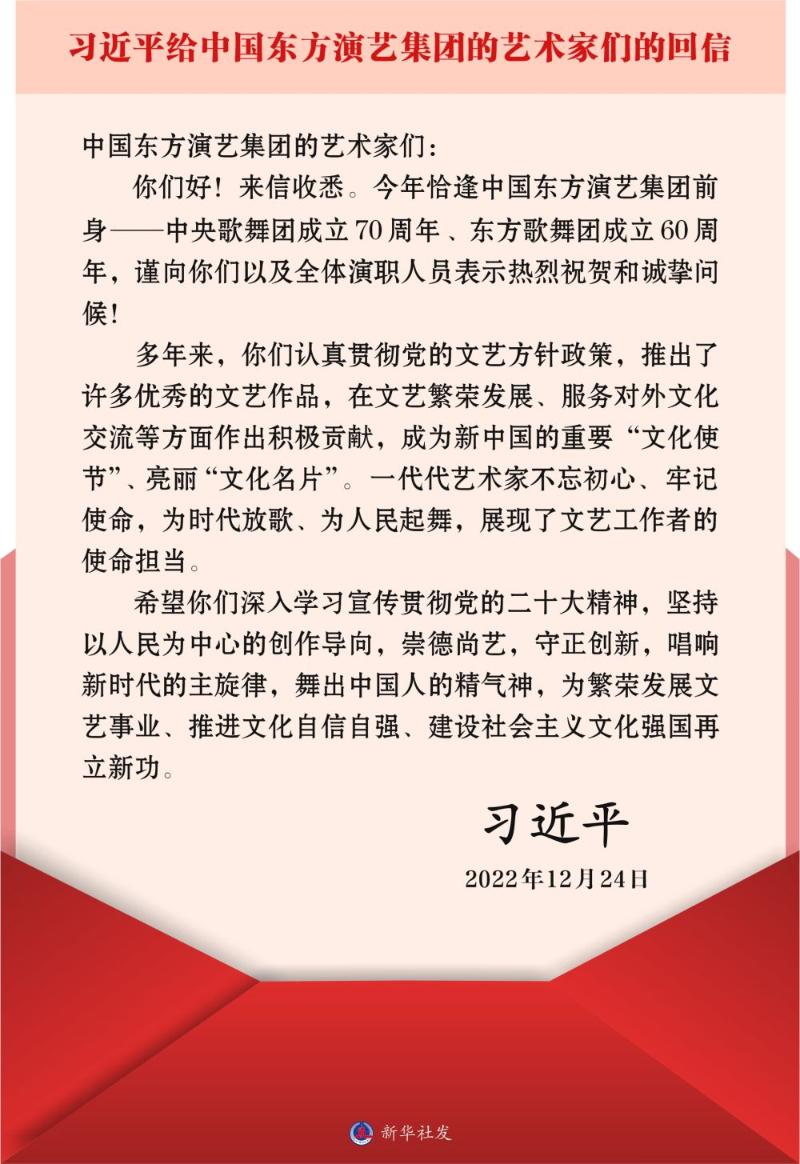 2022年,習近平總書記給中國東方演藝集團的藝術(shù)家們回信,勉勵他們?yōu)榻ㄔO社會主義文化強國再立新功。