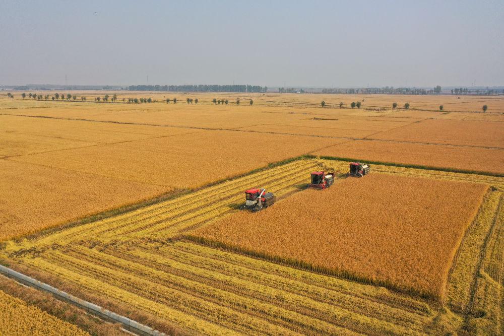 在吉林省公主嶺市,吉林省米兜種植農(nóng)民專業(yè)合作社進(jìn)行機(jī)械化收割水稻作業(yè)展示(2025年10月14日攝,無人機(jī)照片)。新華社記者 張楠 攝