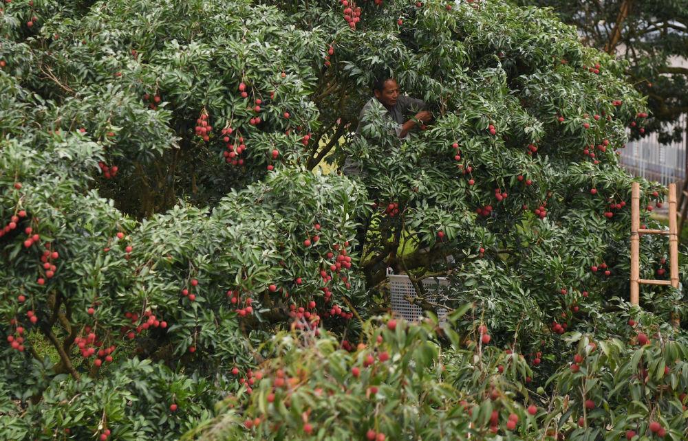 果農(nóng)在廣東茂名高州名園生態(tài)園采摘荔枝(2025年6月4日攝)。新華社記者 鄧華 攝