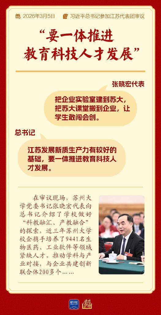 張曉宏代表來自蘇州大學(xué),向總書記介紹了學(xué)校推進(jìn)“科教融匯、產(chǎn)教融合”的探索:“把企業(yè)實(shí)驗(yàn)室建到蘇大,把蘇大課堂搬到企業(yè),讓學(xué)生敢闖會(huì)創(chuàng)?!苯晷F髷y手培養(yǎng)了9441名生物醫(yī)藥、工業(yè)軟件等領(lǐng)域緊缺人才,推動(dòng)學(xué)科與產(chǎn)業(yè)對(duì)接,與企業(yè)共建創(chuàng)新聯(lián)合體200多個(gè)……