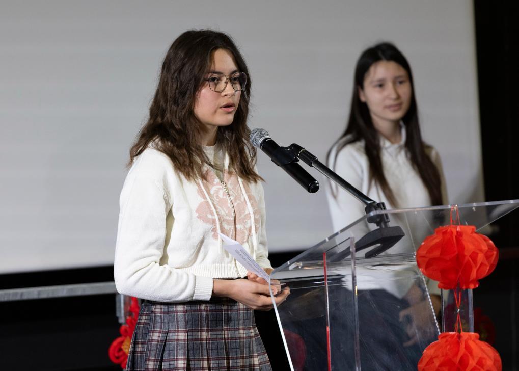 3月12日,在法國普羅旺斯-阿爾卑斯-藍(lán)色海岸大區(qū)國際學(xué)校,中國駐馬賽總領(lǐng)館向?qū)W校轉(zhuǎn)交習(xí)近平主席復(fù)信。這是該校中文班學(xué)生伊西絲在活動現(xiàn)場發(fā)言。新華社記者 鄔惠我 攝