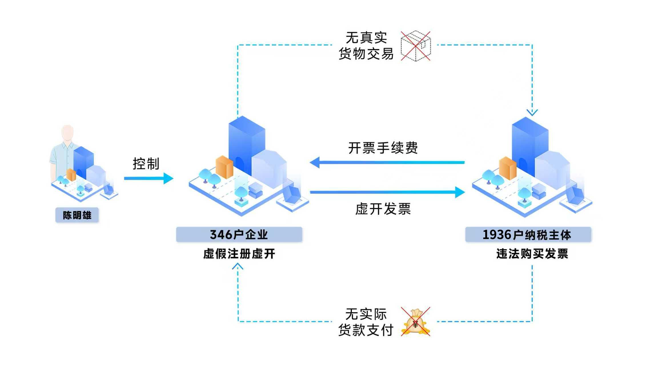 團伙企業(yè)實際控制人陳明雄等人供述了“冒用信息虛開發(fā)票”過程:該團伙通過非法渠道購買公民信息,注冊成立346戶“空殼”公司,根據(jù)下游企業(yè)“購票需求”,對外虛開增值稅普通發(fā)票,并按一定比例收取開票費用。經(jīng)查,團伙企業(yè)累計對外虛開增值稅普通發(fā)票7846份,涉及下游受票企業(yè)1936戶,涉案發(fā)票金額高達12億元。