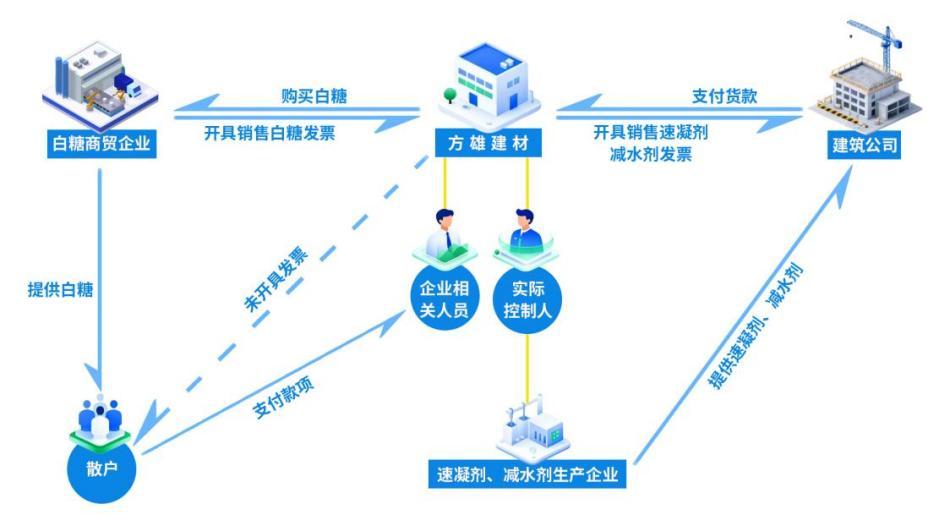 在完整固定證據(jù)鏈后,檢查人員約談實(shí)際控制人,最終公司實(shí)際控制人馬寧主動如實(shí)供述了違法事實(shí):為規(guī)避稅收監(jiān)管方雄建材采購白糖后,憑借“真實(shí)采購獲進(jìn)項(xiàng)、賬外銷售隱銷項(xiàng)”形成富余票;通過控制關(guān)聯(lián)公司向多地的53家公司銷售速凝劑、減水劑,由方雄建材利用富余票對外開具增值稅專用發(fā)票的違法事實(shí)。