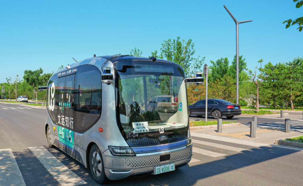 在北京城市副中心,一輛無(wú)人駕駛小巴在接送乘客(2024年5月21日攝) 鞠煥宗攝/本刊