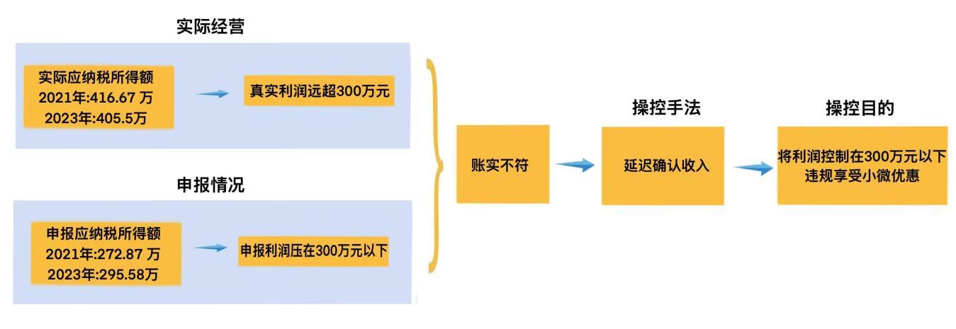經(jīng)核實(shí),2021年該駕校合同載明收入及銀行流水測算的應(yīng)納稅所得額為416.67萬元,申報(bào)為272.87萬元;2023年實(shí)際為405.5萬元,申報(bào)數(shù)為295.58萬元。企業(yè)刻意將應(yīng)納稅所得額控制在300萬元小型微利企業(yè)標(biāo)準(zhǔn)線以下,違規(guī)享受小微企業(yè)稅收優(yōu)惠政策。