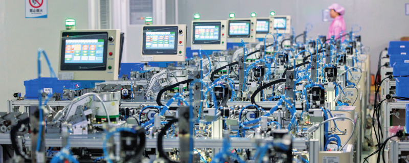 在江西贛州訊康電子科技有限公司,工作人員從T1—T2全自動穿環(huán)機旁走過,該機器生產磁性元器件(資料照片)。才揚攝/本刊