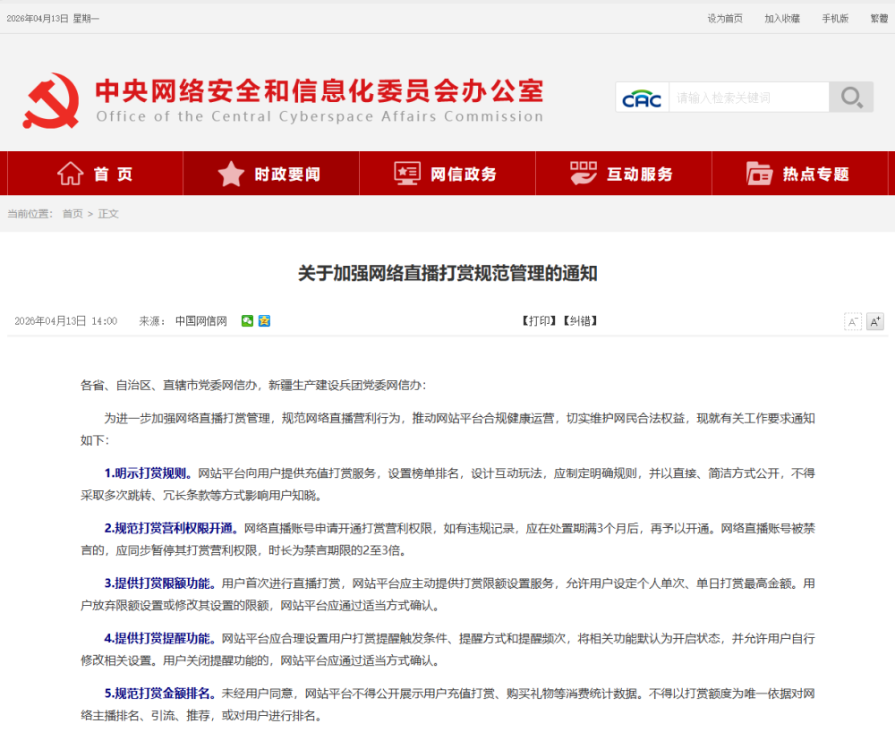 為進(jìn)一步加強(qiáng)網(wǎng)絡(luò)直播打賞管理,規(guī)范網(wǎng)絡(luò)直播營利行為,推動(dòng)網(wǎng)站平臺(tái)合規(guī)健康運(yùn)營,切實(shí)維護(hù)網(wǎng)民合法權(quán)益,現(xiàn)就有關(guān)工作要求通知如下: