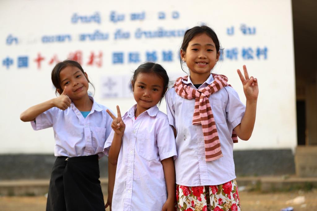 聽松村的孩子們在中資企業(yè)援建的學校里合影。新華社發(fā) 杜大鵬 攝