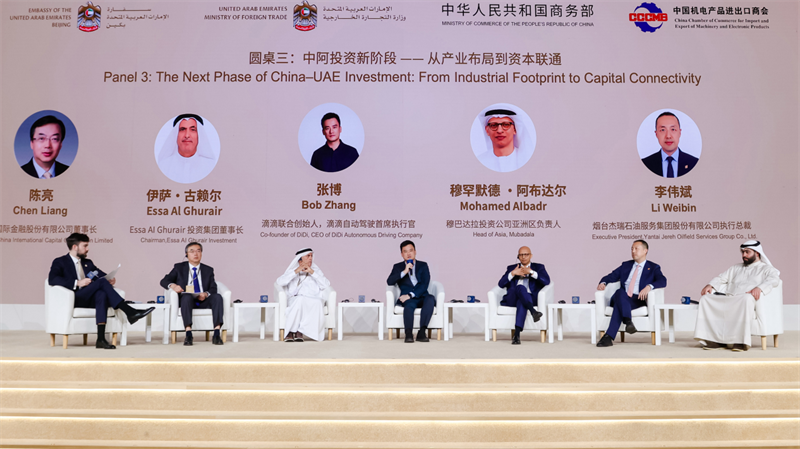 在中國(guó)阿聯(lián)酋企業(yè)推介會(huì)圓桌論壇上,張博(左四)與中阿雙方代表共同探討合作新機(jī)遇