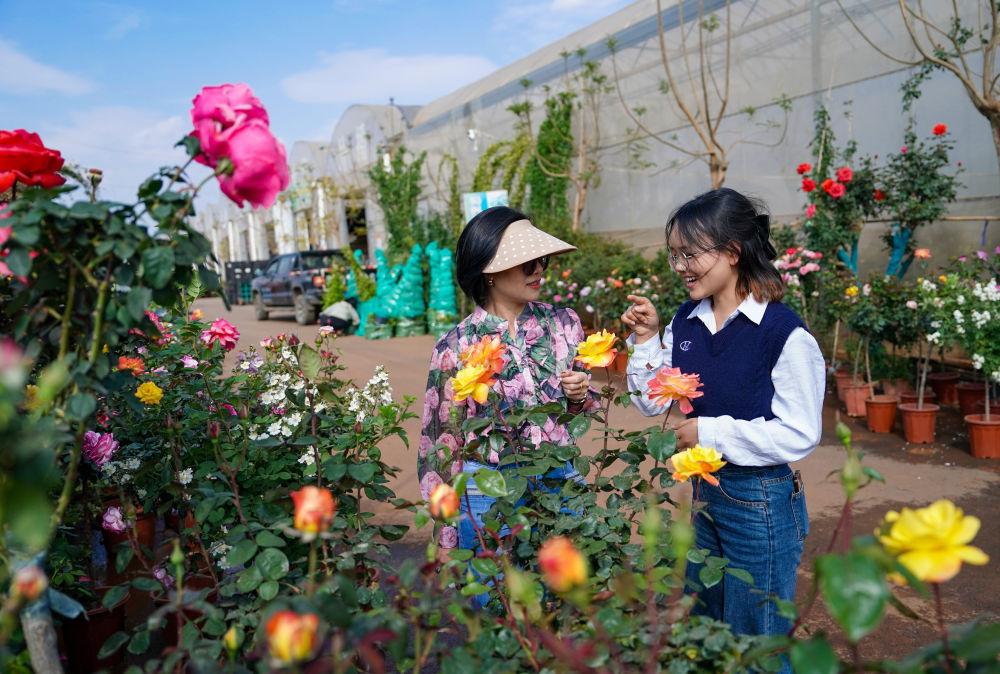 2025年4月11日,越南花商阮翠云(左)與翻譯李青歌在云南昆明斗南一花卉基地內(nèi)查看鮮花品質(zhì)。2018年,阮翠云開始在越南銷售云南花卉,讓七彩“云花”成為眾多越南家庭的“??汀薄=柚咝У碾娚唐脚_(tái)和快捷的物流網(wǎng)絡(luò),鮮花從云南花田到河內(nèi)貨架實(shí)現(xiàn)了“次日達(dá)”。