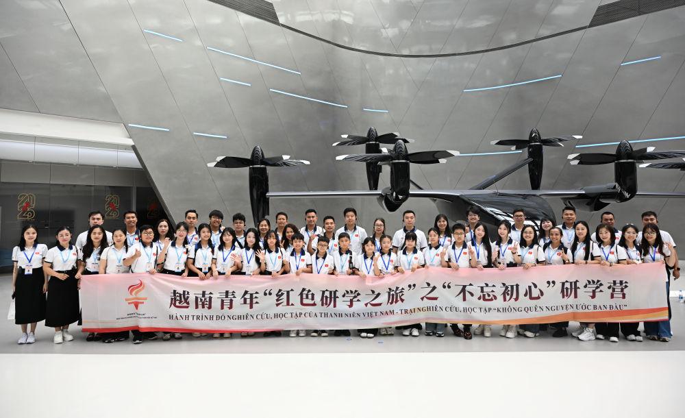 4月13日,越南青少年在廣州的小鵬科技園合影留念。