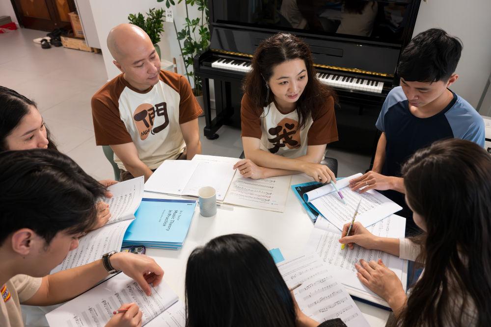 越南指揮家童光榮和中國(guó)作曲家莫雙雙是一對(duì)“跨國(guó)伉儷”,兩人聯(lián)手創(chuàng)立了“新活力”樂(lè)團(tuán),將越南傳統(tǒng)竹樂(lè)和中國(guó)音樂(lè)元素融合編排,演繹出新的東方韻味。這是2025年3月28日,童光榮(中左)與莫雙雙(中右)在位于越南首都河內(nèi)的家中為樂(lè)團(tuán)成員授課。
