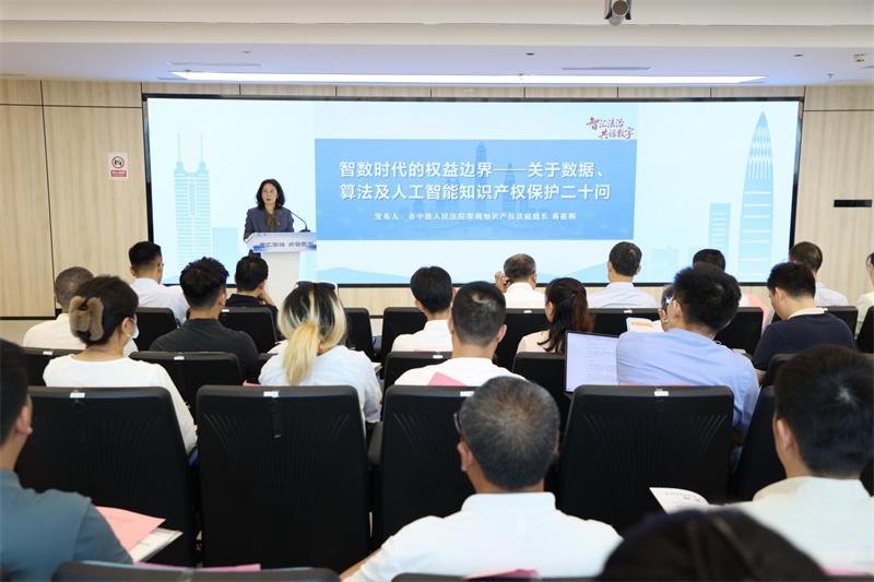 活動伊始,市中級人民法院深圳知識產(chǎn)權(quán)法庭庭長蔣筱熙發(fā)布《智數(shù)時代的權(quán)益邊界——關(guān)于數(shù)據(jù)、算法及人工智能知識產(chǎn)權(quán)保護(hù)二十問》(以下簡稱《二十問》)。《二十問》緊扣企業(yè)經(jīng)營和產(chǎn)業(yè)發(fā)展中的數(shù)據(jù)、人工智能相關(guān)痛點(diǎn),聚焦數(shù)據(jù)抓取合法性、算法商業(yè)秘密保護(hù)、AI生成內(nèi)容權(quán)利歸屬等高頻問題,將宏觀法律原則轉(zhuǎn)化為具體實(shí)踐指引,為企業(yè)提供“看得懂、用得上”的法律導(dǎo)航,打通立法原則與企業(yè)合規(guī)實(shí)踐的“最后一公里”。隨后,深圳知識產(chǎn)權(quán)法庭法官張婷解讀了《二十問》的起草背景與依據(jù),從法理、司法方法、產(chǎn)業(yè)實(shí)踐等方面進(jìn)行系統(tǒng)化闡釋。
