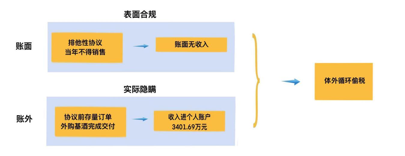 隨著檢查的深入,企業(yè)法定代表人承認(rèn),為了履行2021年前簽訂且已收取定金的存量合同,鵬程酒廠在簽訂排他性協(xié)議后,通過外購基酒和包裝材料完成了訂單交付,而這些交易產(chǎn)生的銷售收入,均未經(jīng)過企業(yè)對公賬戶。