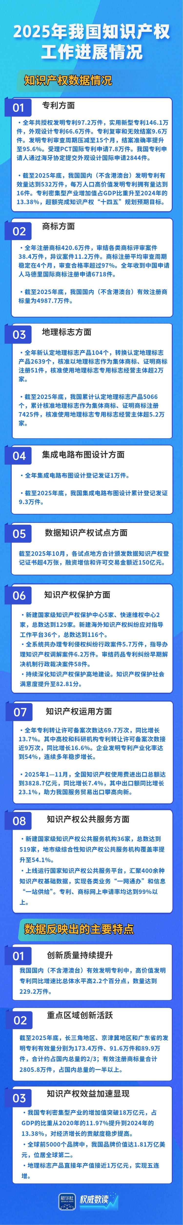 發(fā)明專利有效量達(dá)532萬件,人工智能專利有效量居全球前列,地理標(biāo)志產(chǎn)品直接年產(chǎn)值實(shí)現(xiàn)五連增……在23日國新辦新聞發(fā)布會上,國家知識產(chǎn)權(quán)局介紹2025年我國知識產(chǎn)權(quán)工作進(jìn)展情況。跟隨海報(bào),一起來看看吧。