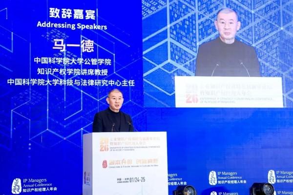 1月24日至25日,2026年知識(shí)產(chǎn)權(quán)戰(zhàn)略發(fā)展新年論壇暨知識(shí)產(chǎn)權(quán)經(jīng)理人年會(huì)在北京舉行。在開幕式上,中國科學(xué)院大學(xué)公共政策與管理學(xué)院、知識(shí)產(chǎn)權(quán)學(xué)院講席教授、中國科學(xué)院大學(xué)科技與法律研究中心主任馬一德發(fā)表致辭。他在回顧并反思知識(shí)產(chǎn)權(quán)學(xué)科與制度所面臨的深刻挑戰(zhàn)后,呼吁當(dāng)代中國知識(shí)產(chǎn)權(quán)人努力繼承和發(fā)揚(yáng)中國知識(shí)產(chǎn)權(quán)學(xué)科奠基人劉春田教授的擔(dān)當(dāng)精神、學(xué)術(shù)風(fēng)骨與責(zé)任意識(shí)。