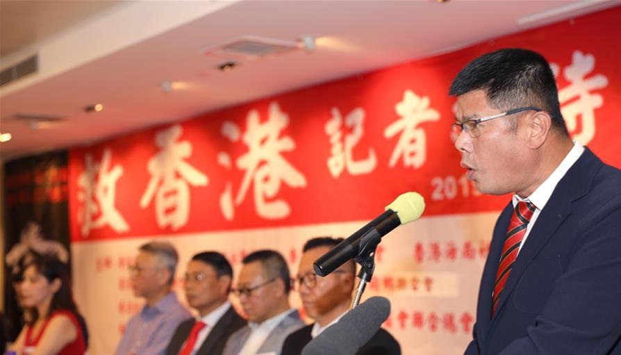8月15日,香港福建社團聯(lián)會副主席蔡建四在會上宣讀這些社團發(fā)表的聯(lián)署聲明《反暴力 救香港》。 新華社記者 吳曉初 攝