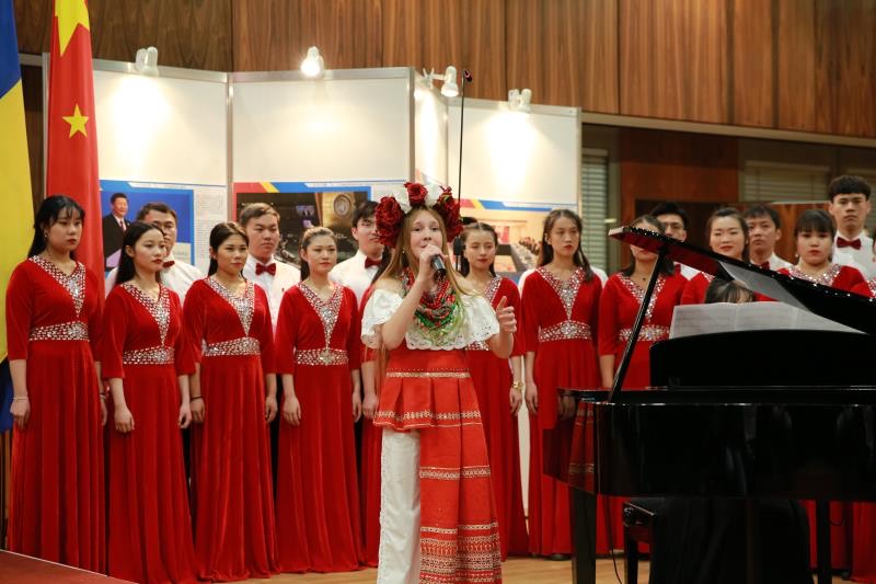 招待會(huì)在中國(guó)留學(xué)生藝術(shù)團(tuán)合唱隊(duì)用中烏雙語(yǔ)演唱的兩國(guó)國(guó)歌聲中拉開帷幕,現(xiàn)場(chǎng)觀眾對(duì)此報(bào)以熱烈掌聲,從一開始就把招待會(huì)氣氛推向了高潮。