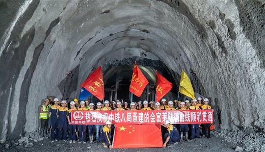 7月23日,中國中鐵八局員工在老撾北部烏多姆賽省貫通會富萊隧道后合影。 中老鐵路全線控制性工程——會富萊隧道23日貫通,為后續(xù)架梁鋪軌施工、實現(xiàn)2021年全線通車目標(biāo)創(chuàng)造條件。 新華社發(fā)(中鐵八局供圖)