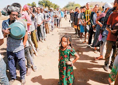 十一月二十八日,在蘇丹靠近埃塞俄比亞的邊境地帶,從提格雷州逃離的埃塞俄比亞難民排隊等待領(lǐng)取食物。新華社/路透