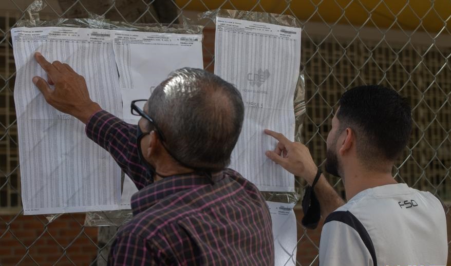 12月6日,市民在委內(nèi)瑞拉加拉加斯一個投票站外核對選民名單上的信息。