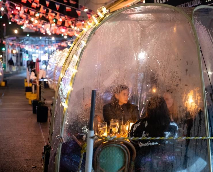12月14日,在美國(guó)紐約,人們?cè)谝患也蛷d的室外就餐區(qū)就餐。