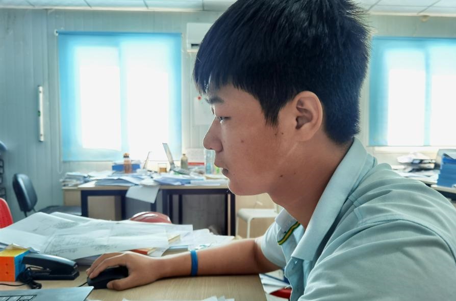 12月15日,在馬爾代夫馬累,一名臉上有口罩印的技術人員在維拉納國際機場水飛航站樓項目辦公室工作。新華社發(fā)(北京城建集團供圖)
