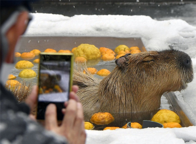 人民網(wǎng)訊 當(dāng)?shù)貢r(shí)間12月20日,日本鳥取縣,水豚享受露天柚子浴。