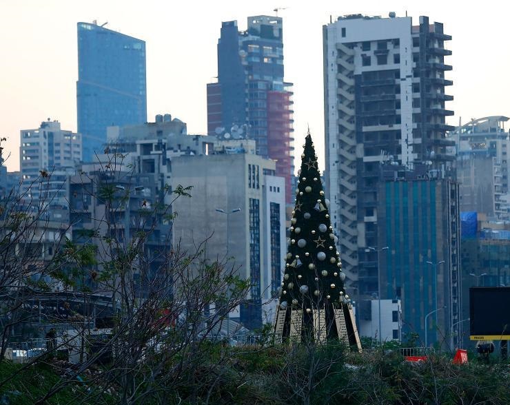 12月22日,黎巴嫩貝魯特港口爆炸廢墟附近一棵圣誕樹上面掛著爆炸中死難者的名字。新華社發(fā)(比拉爾·賈維希攝)