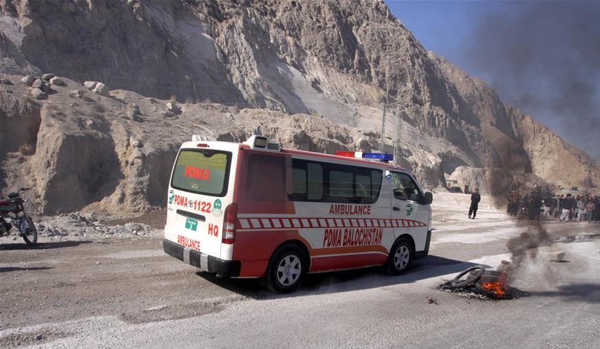 1月3日,在巴基斯坦西南部俾路支省首府奎達,運送煤礦遇襲罹難者遺體的救護車從路上駛過。 巴基斯坦官員3日說,俾路支省博蘭地區(qū)一座煤礦2日晚遭不明身份武裝分子襲擊,目前已造成11人死亡。 新華社發(fā)(阿薩德 攝)