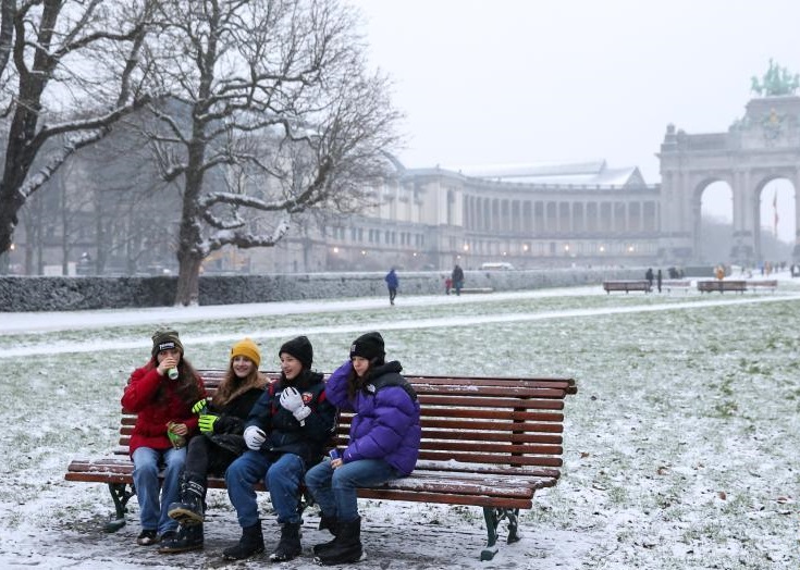 1月16日,人們在比利時布魯塞爾五十周年紀(jì)念公園欣賞雪景。